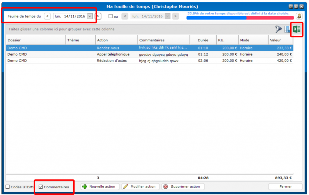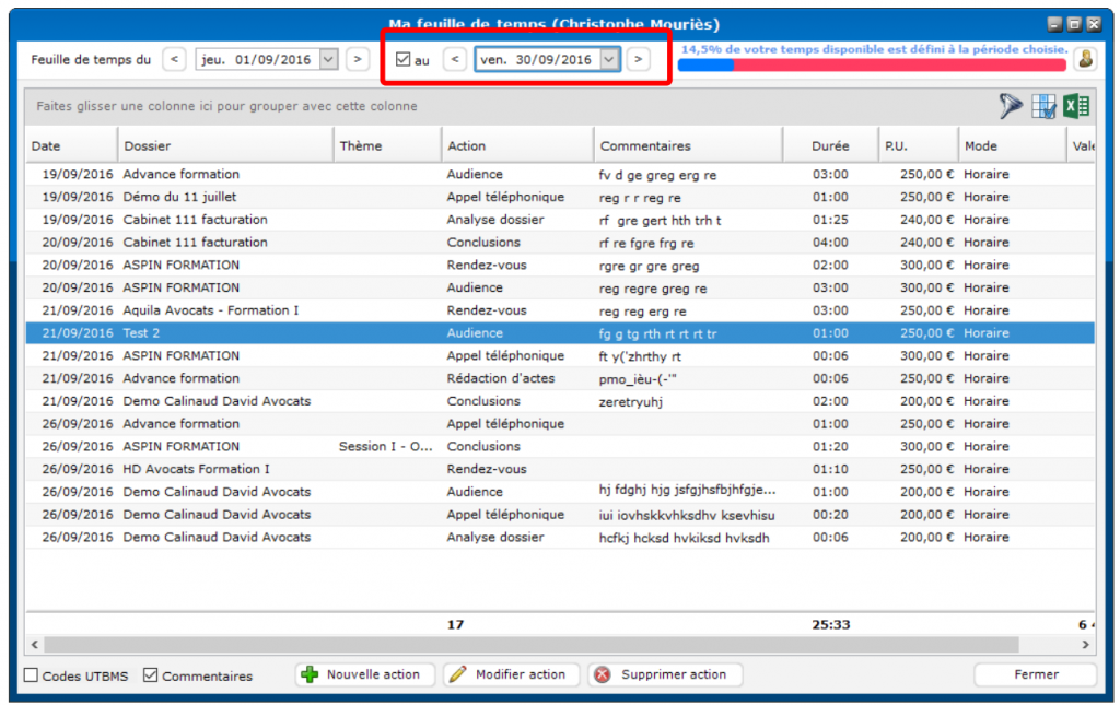 La liste des temps affiche le dossier, le thème du dossier s’il existe, l’action, les commentaires, la durée, le prix unitaire, le mode et la valeur de facturation. Notez qu’en fonction de votre profil utilisateur, les colonnes « P.U. », « Mode » et « Valeur » peuvent ne pas apparaitre dans la fenêtre.