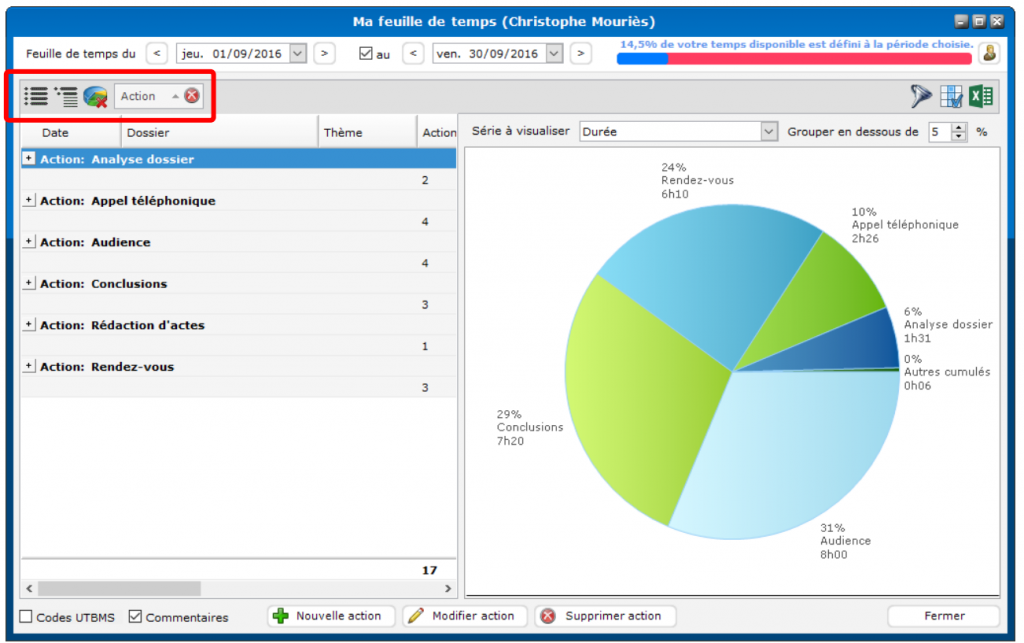 Si vous visualisez une période, il peut être intéressant de vouloir savoir comment se réparti votre temps en fonction de vos dossiers ou même de la nature des actions que vous avez mise en œuvre.
