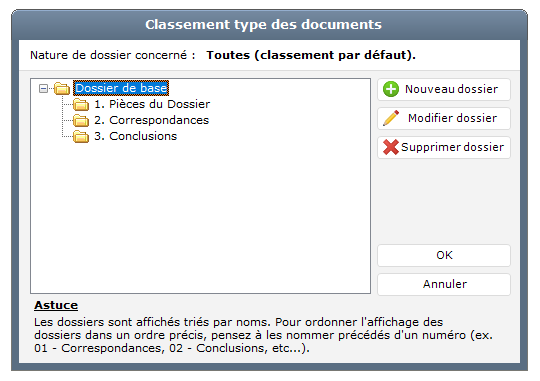 Ce classement type de documents sera mis en place si vous n’avez pas défini de nature de dossier ou encore si la nature de dossier affectée n’a pas de classement type de documents.