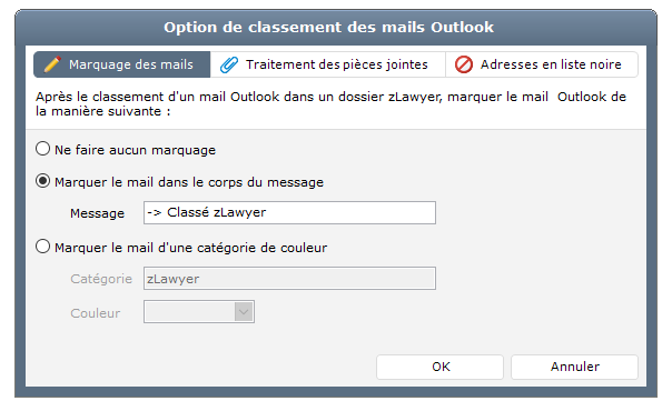 Après le classement d’un mail Outlook dans un dossier zLawyer, vous pouvez marquer l’email de la manière suivante: