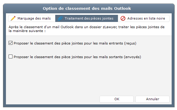 zLawyer propose de classer les pièces jointes de vos emails directement dans votre dossier. Vous avez la possibilité d’activer cette fonctionnalité pour les emails reçus ainsi que les emails envoyés à l’aide des deux paramètres suivants :