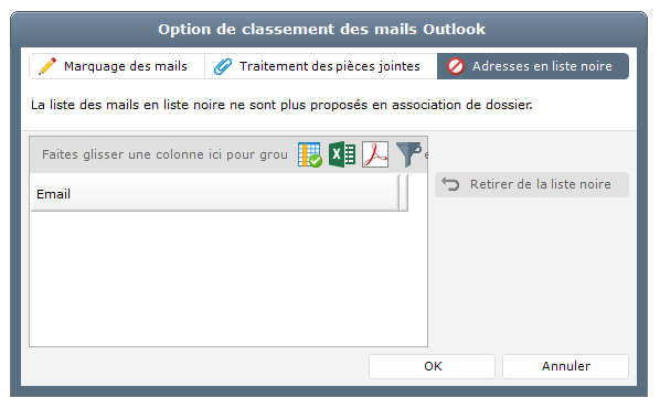 Cette association email / dossier est enregistrée dans votre base de données. Si vous souhaitez retirer cette association, vous pourrez le faire depuis l’onglet Adresses en liste noire.