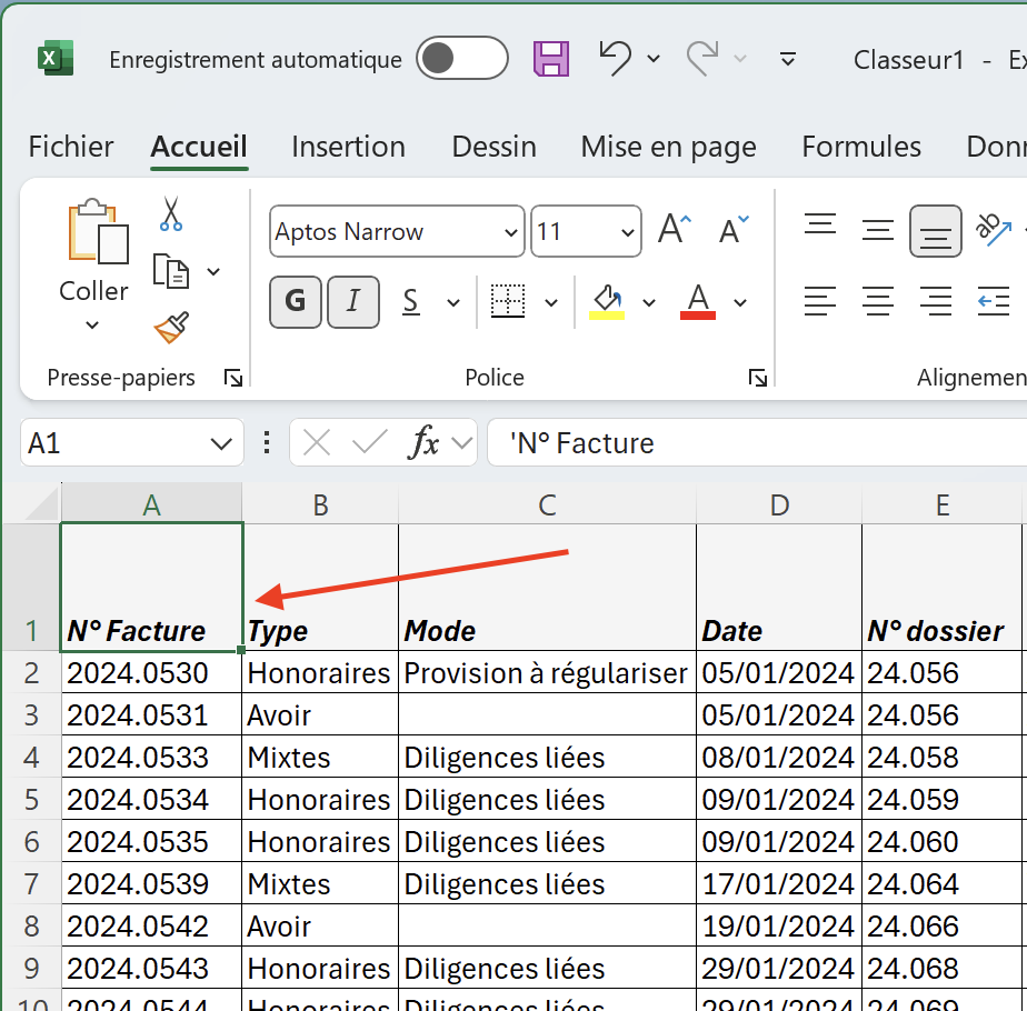 Ouvrez le fichier Excel généré depuis zLawyer, puis sélectionnez la ligne contenant l’entête.