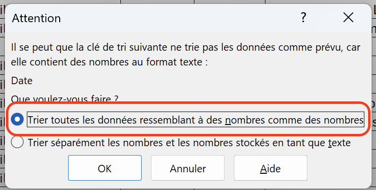 Il faut prendre l’option “Trier les données ressemblant à des nombres comme des nombre”, puis cliquez sur “OK”.