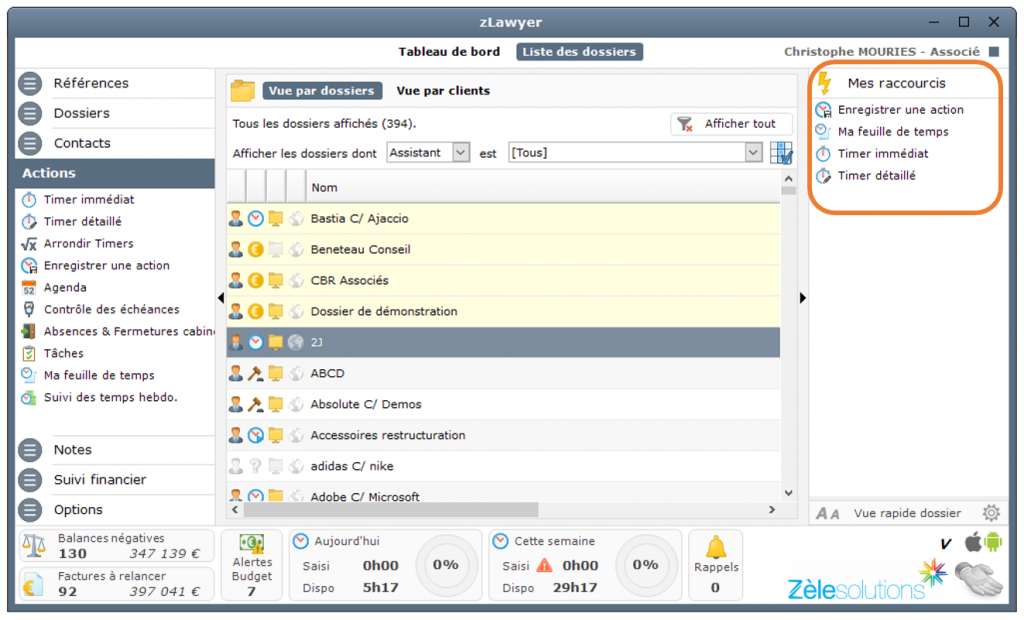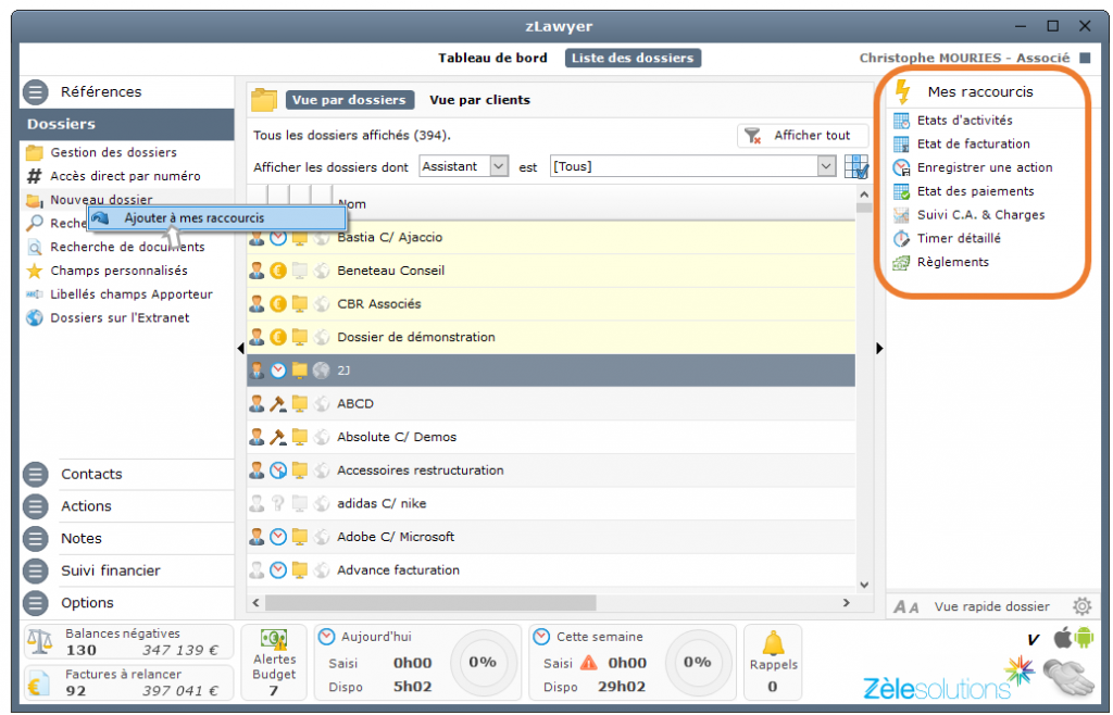 Vous pouvez vous constituer un menu personnalisé à droite de l’écran constitué des commandes zLawyer qui vous semblent les plus importantes.