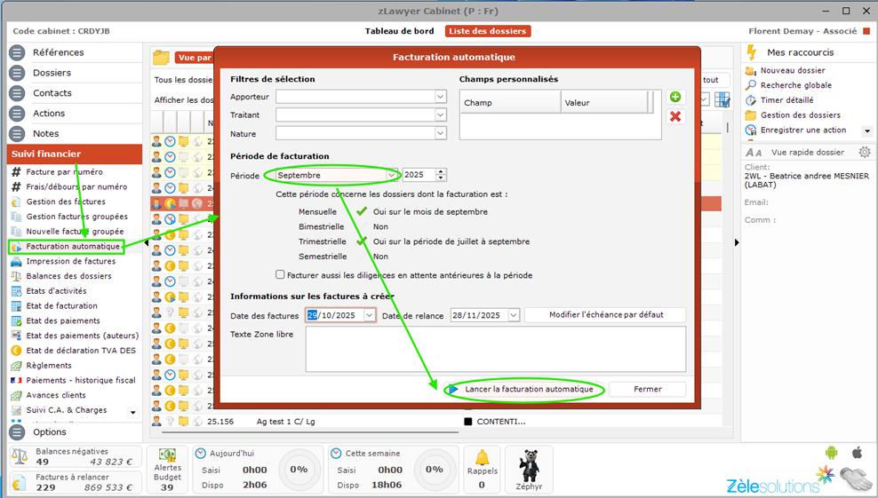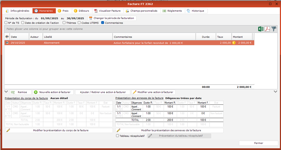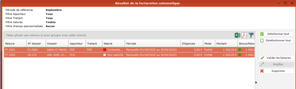 Les factures sont alors générées automatiquement avec le statut « Facture temporaire ».