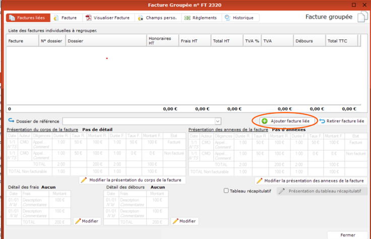 Une fenêtre s’ouvre. Cliquez sur Ajouter facture liée.