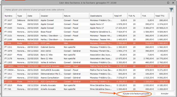Sélectionnez les factures à regrouper (Shift + clic droit pour en sélectionner plusieurs).