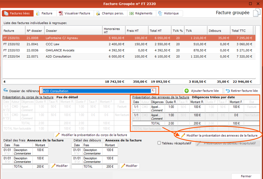 • ✅ Sélectionner un dossier de référence (il apparaîtra sur la facture groupée)