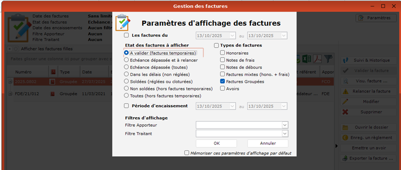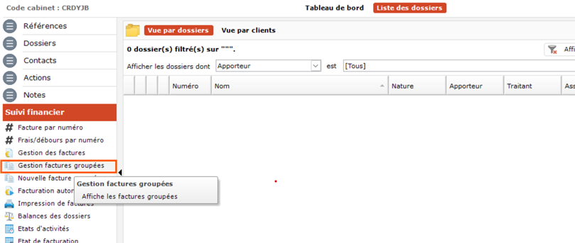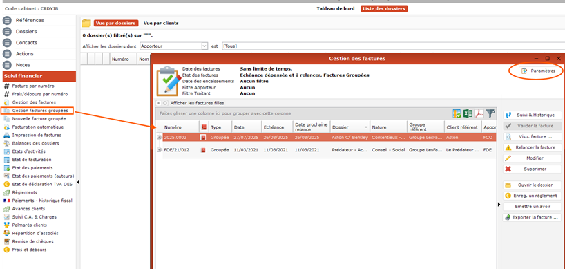 Vous pouvez également la retrouver dans Suivi financier > Gestion des factures groupées.