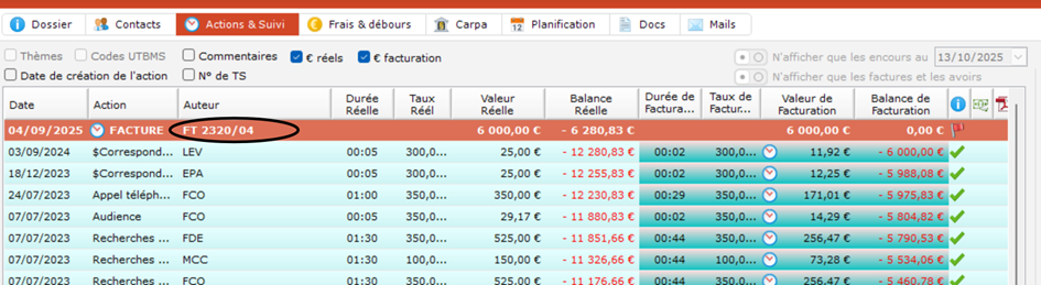Dans un dossier, une facture groupée se reconnaît grâce à l’ajout de « /n°+1» à la fin de son numéro.