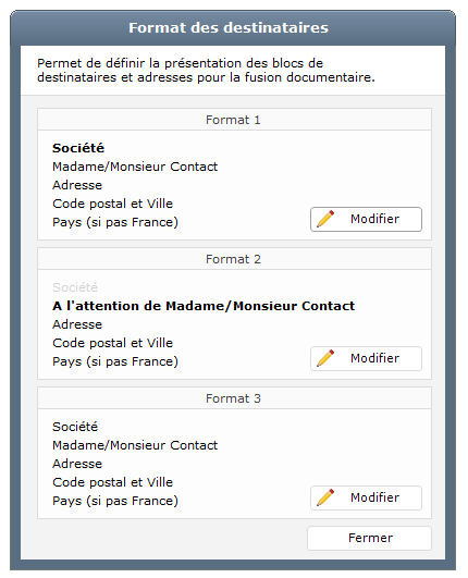zLawyer propose de formater trois blocs de destinataires et adresses pour la fusion de documents. Vous pouvez par exemple utiliser un format pour écrire à un client et un autre format pour le destinataire de factures.
