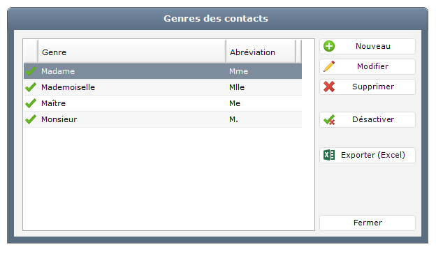 Ce référentiel permet de personnaliser les abréviations ou les genres des contacts lors de la fusion de documents.Cette fonctionnalité est disponible depuis le menu Références, puis Genres des contacts.