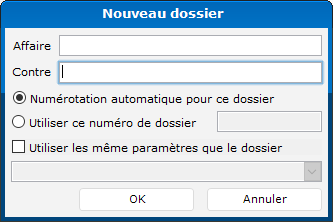 Apparaît alors la fenêtre suivante qu’il faut renseigner du nom de l’affaire et de la partie adverse s’il y en a une. Le numéro de dossier est attribué par le système. Il est proposé de dupliquer les paramètres d’un autre dossier, cela joue en particulier sur la tarification horaire par avocat et sur la présentation éventuellement personnalisée des factures.