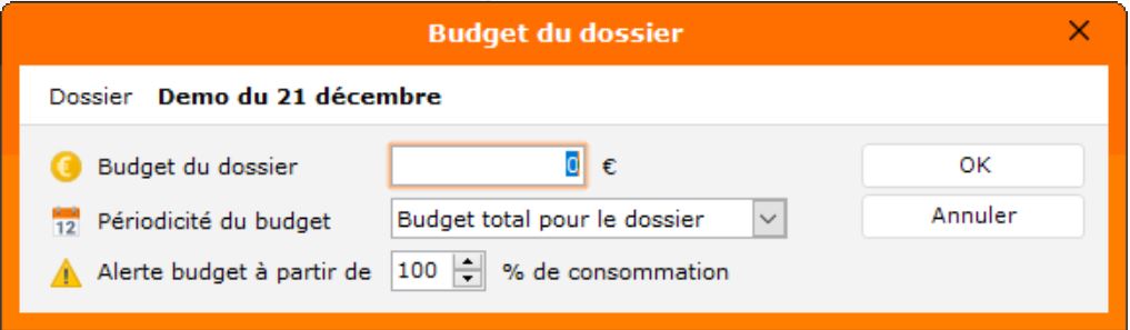Le budget permet comme son nom l’indique de renseigner le montant de l’enveloppe prévue ou prévisible pour ce dossier. Il est donc ici possible en cliquant sur le bouton « modifier » d’appeler la fenêtre suivante :