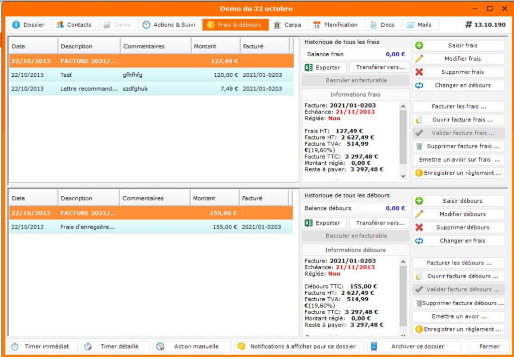 L’écran propose une grande souplesse dans la saisie, l’enregistrement, la modification des frais et débours, ou la transformation de leur statut de l’un vers l’autre.