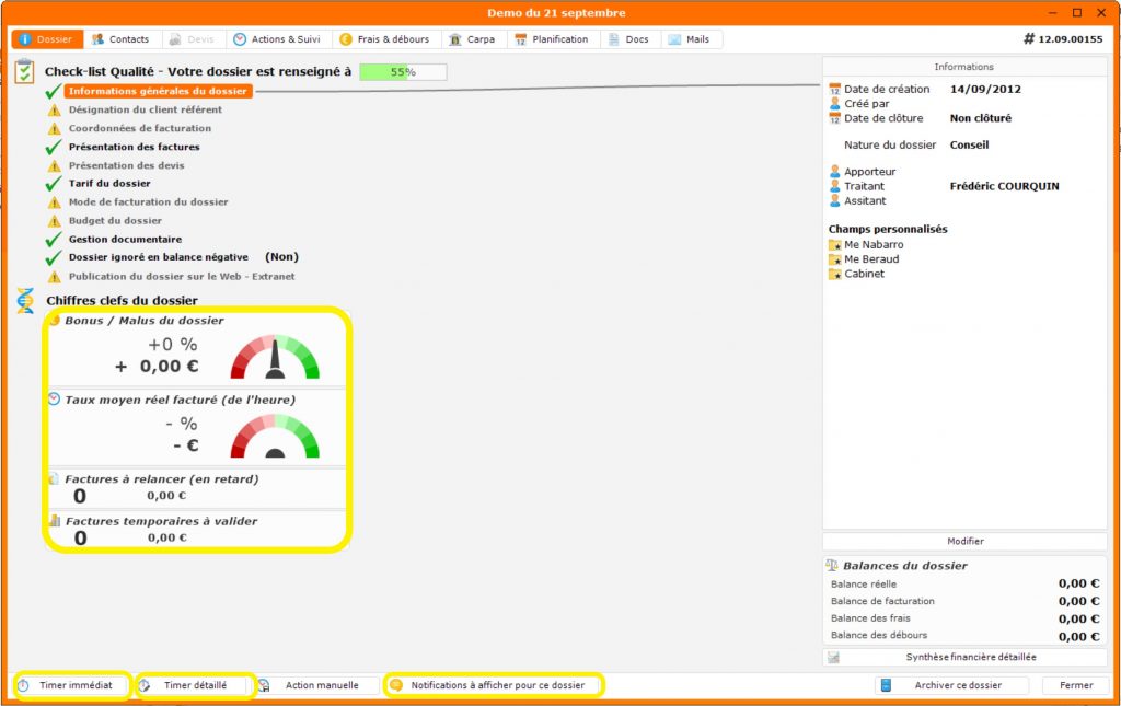 Il est ici possible d’obtenir certaines analyses synthétiques, ou plus détaillées en cliquant sur la zone analysée. Ces analyses sont utiles par exemple pour savoir s’il faut facturer, si le client paie correctement, et si le dossier est rentable pour le cabinet.