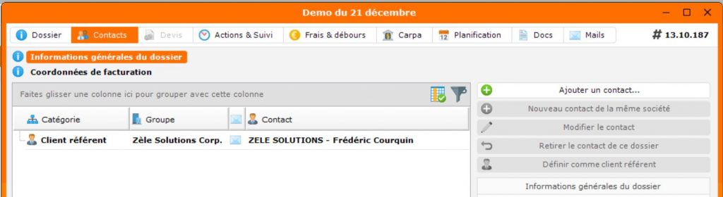 Un dossier doit toujours être rattaché à un client référent auquel sera rattaché le chiffre d’affaires. Ce client référent sera aussi souvent le client de facturation par défaut. Lorsque le client référent n’est pas encore créé, un double click sur ce chapitre emmène directement l’utilisateur sur l’espace de création client dans l’onglet contact présenté au chapitre 1.3.1