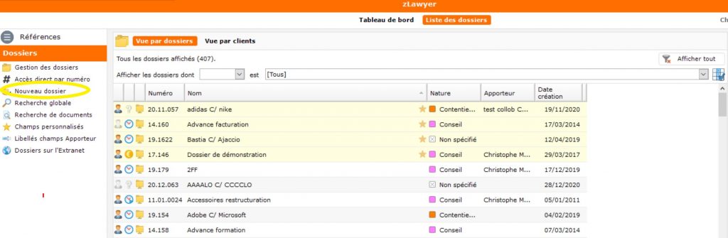 La création d’un dossier se fait en cliquant sur le sous-menu « Nouveau dossier » du menu « Dossiers ».