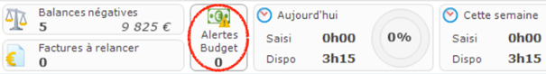 Cette fenêtre permet de renseigner le montant du budget, sa périodicité et permet de définir un pourcentage de consommation qui s’il est dépassé, génèrera une alerte. Cette alerte est visible en cliquant sur l’icône suivant dans l’affichage de la fenêtre principale du logiciel.