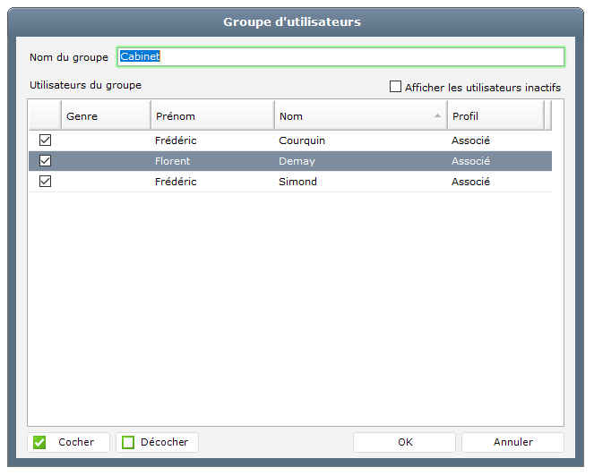 Une fois le ou les groupes créés, sélectionnez les utilisateurs à insérer dans le groupe. Les profils inactifs peuvent également être affectés au groupe.