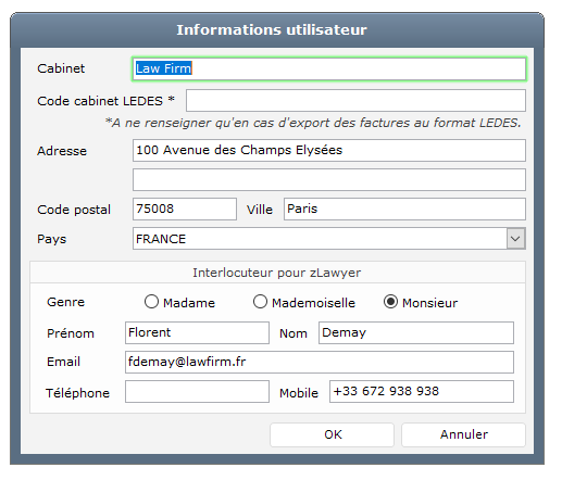 C’est également à ce niveau que le code cabinet LEDES devra être saisis pour l’émission des factures électronique au format LEDES.