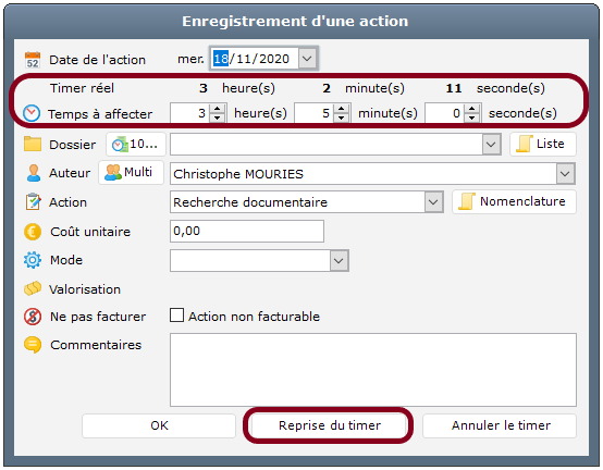 En bas de la fenêtre, un bouton « Reprise du timer » permet la fermeture de cette fenêtre d’enregistrement et la reprise du comptage du temps par le chronomètre.