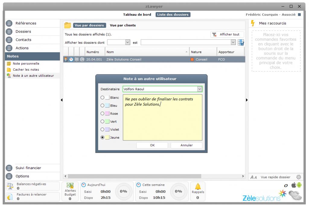Vous pouvez envoyer une note à un autre utilisateur actif de zLawyer. Ce dernier verra apparaître sur son écran une note sous forme de post-it. Cette fonctionnalité est disponible depuis le menu Notes puis Note à un autre utilisateur. Vous pouvez également choisir la couleur de la note.