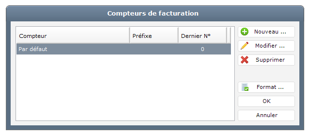 Ce paramètre vous permet de régler votre ou vos compteurs de facturation. Cette fonctionnalité est disponible depuis le menu Options, puis Numérotation des factures.