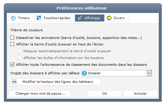 Vous pouvez paramétrer zLawyer afin de l’adapter à votre profil utilisateur. Ces préférences sont accessibles depuis le menu Options, puis Personnalisation.