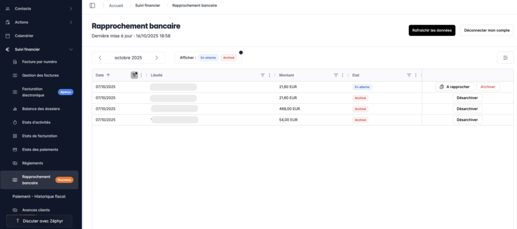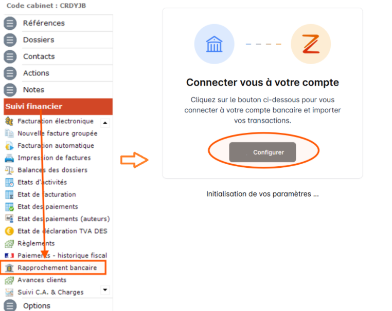 • Dans votre espace zLawyer, cliquez sur “Suivi financier / Rapprochement bancaire”
