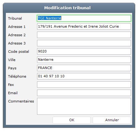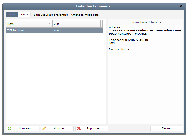 Ce référentiel permet de créer une liste de tribunaux disponible dans la gestion des contacts du dossier. Ces données pourront être également exploitées dans la génération de documents dans les dossiers.